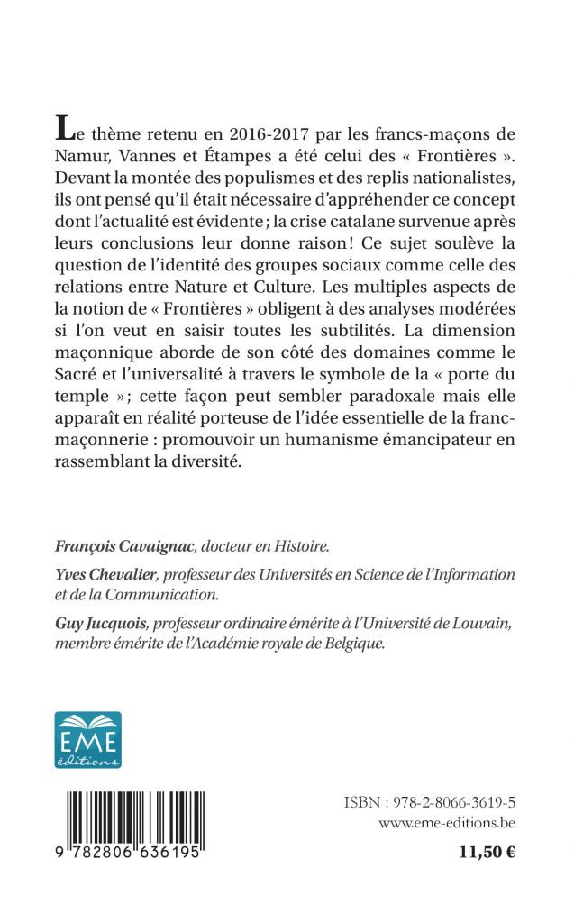 QUESTIONS DE MAÇONS SUR LES FRONTIÈRES de François Cavaignac ,‎ Yves Chevalier ,‎ Guy Jucquois – (EME éditions – 8 décembre 2017)