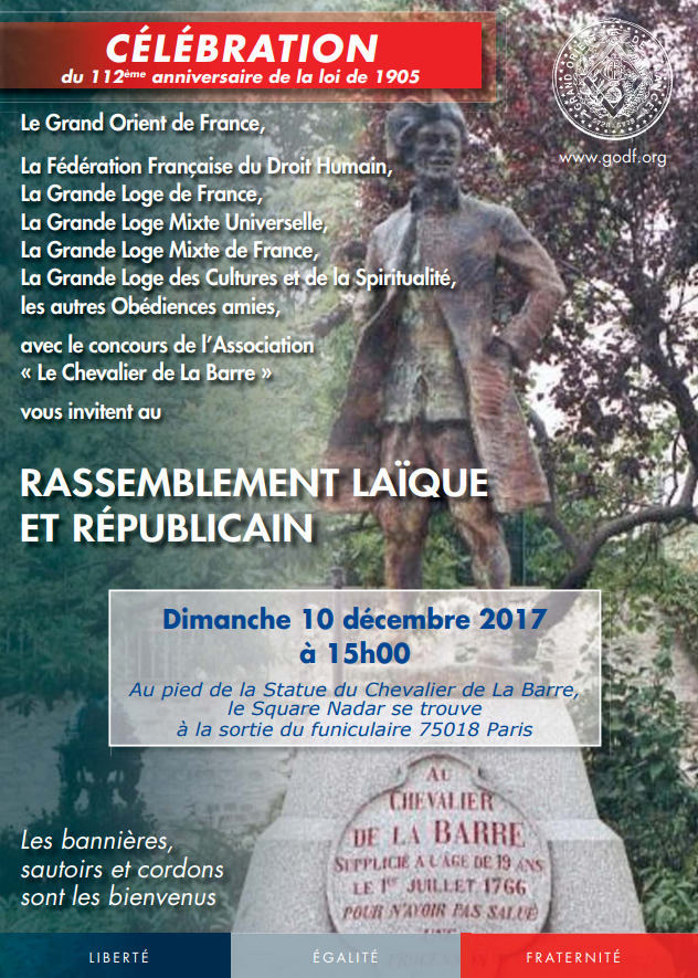 Rassemblement laïque et républicain le dimanche 10 décembre 2017 à 15h00, au pied de la Statue du Chevalier de La Barre, le Square Nadar se trouve à la sortie du funiculaire 75018 Paris