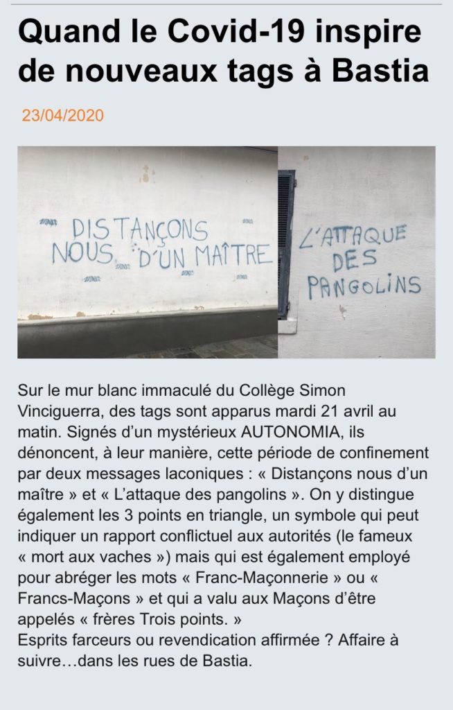 REFLEXION EN IMAGE : TAGS « ANTIMAÇONNIQUES » ? Anti-maçonnique, Réflexions | 26 avril 2020 | 0 | by A.S. Source : https://www.corsenetinfos.corsica/notes/Quand-le-Covid-19-inspire-de-nouveaux-tags-a-Bastia_b45189426.html