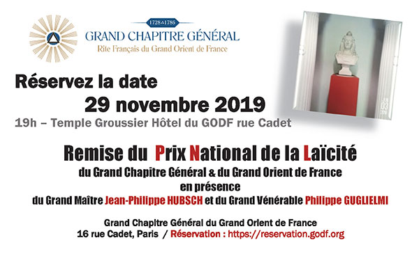 Remise du Prix National de la Laïcité du Grand Chapitre Général & du Grand Orient de France vendredi 29 novembre 2019 au siège du Grand Orient de France, à PARIS.