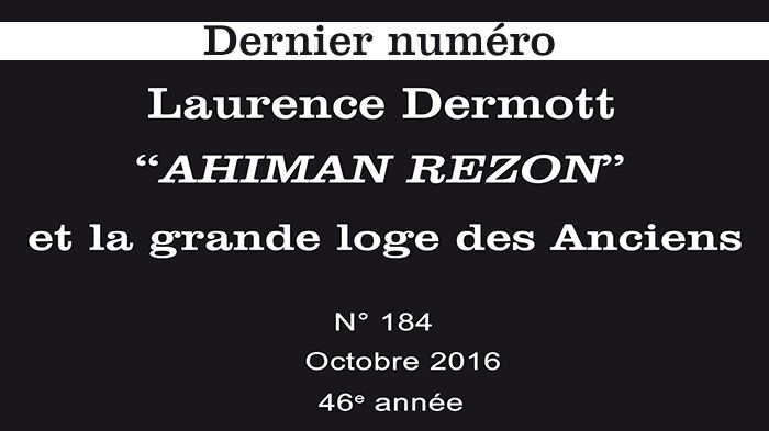 La revue Renaissance Traditionnelle et son dernier numéro N° 184 (octobre 2016) dont le thème est consacré à : Laurence Dermott « AHIMAN REZON » et la grande loge des Anciens.