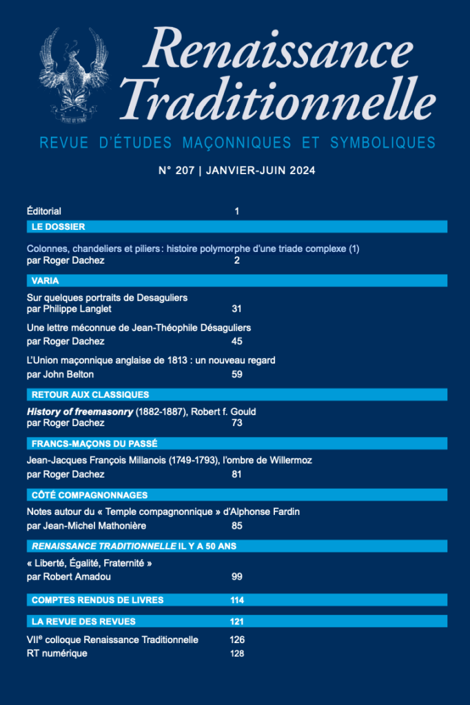Pour ce n° 207, dans le dossier central intitulé « Chandeliers, colonnes et piliers – Histoire polymorphe d’une triade complexe », nous proposons à nos lecteurs la première partie une déambulation historique parmi les ternaires – fameux mais souvent rattachés à des sources illusoires – que sont, d’une part, Sagesse, Force et Beauté, et de l’autre le Soleil, la Lune, le Maître de la loge.