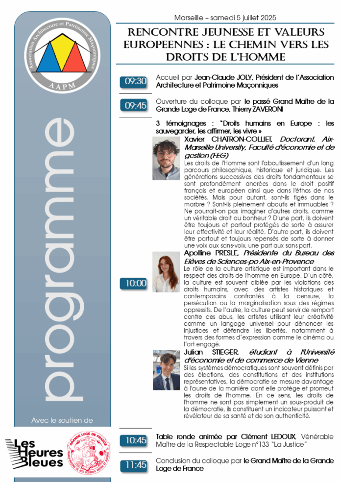 L’Association Architecture et Patrimoine Maçonniques (AAPM) organise les « Rencontres jeunesse et valeurs européennes : le chemin vers les droits de l’Homme », au Château Saint-Antoine (Marseille), le samedi 5 juillet à 9 h 30.