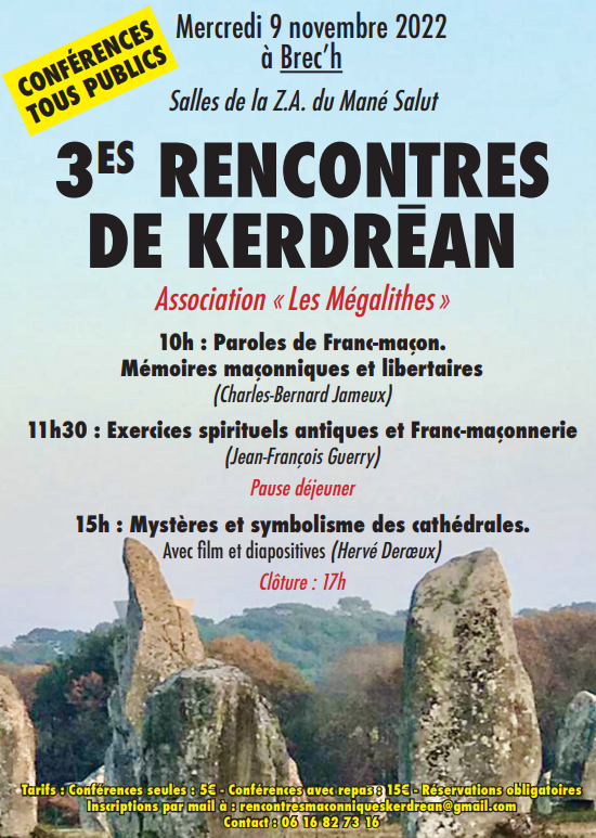 Réservation obligatoire par mail : rencontresmaconniqueskerdrean@gmail.com