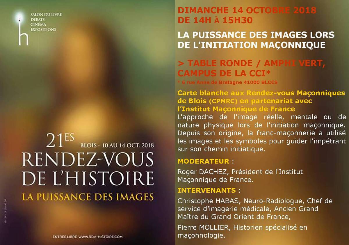 Les Rendez-vous Maçonniques de Blois, en partenariat avec l’Institut Maçonnique de France, présents sur le festival des Rendez-vous de l’Histoire, vous proposent une table ronde sur la thématique « La puissance des images lors de l’initiation maçonnique »