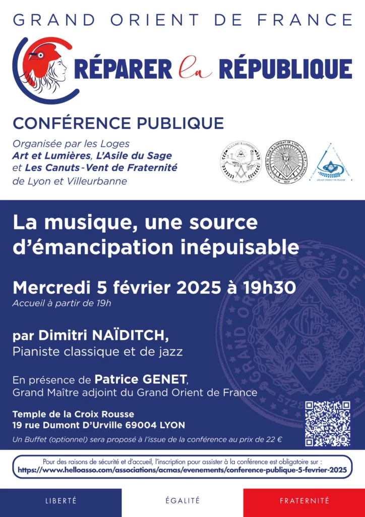 Conférence publique dans le cadre du cycle Réparer la République, organisée par les Loges Art et Lumières, L’Asile du Sage et Les Canuts – Vent de Fraternité de Lyon et Villeurbanne