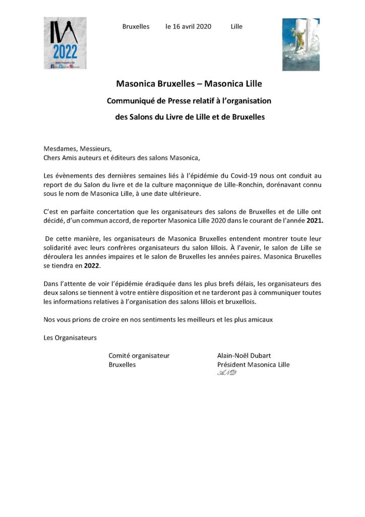 C’est par un communiqué ddu Comité organisateur de Bruxelles et d’ Alain-Noël Dubart, Président Masonica Lille que nous avons appris le report des salons maçonniques du Livre de Bruxelles et de Lille