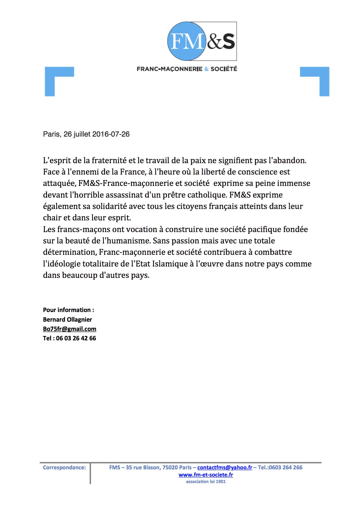 Communiqué du think tank Franc-Maçonnerie et Société (FM&S) sur le drame de Saint-Étienne-du-Rouvray :
