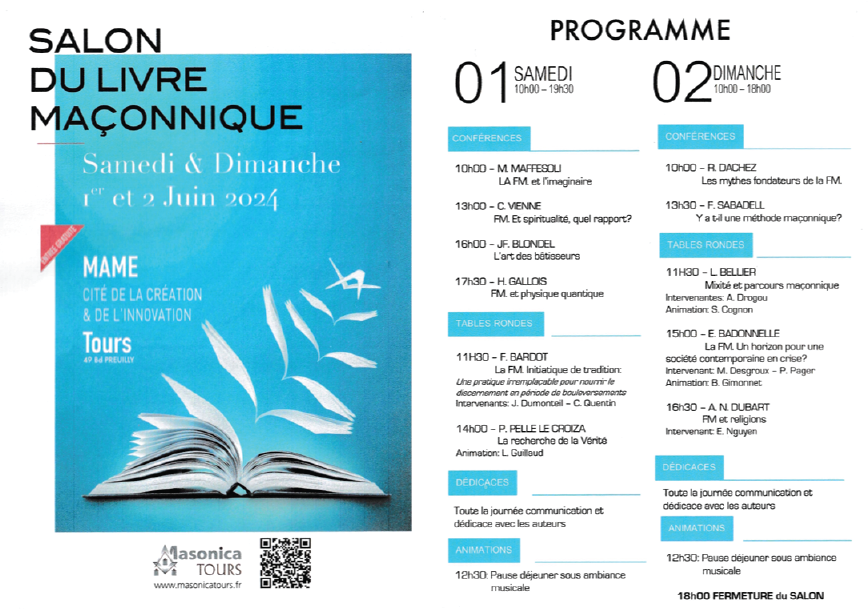 Le samedi 1er et le dimanche 2 juin 2024 se déroulera le premier Salon du Livre maçonnique de Tours