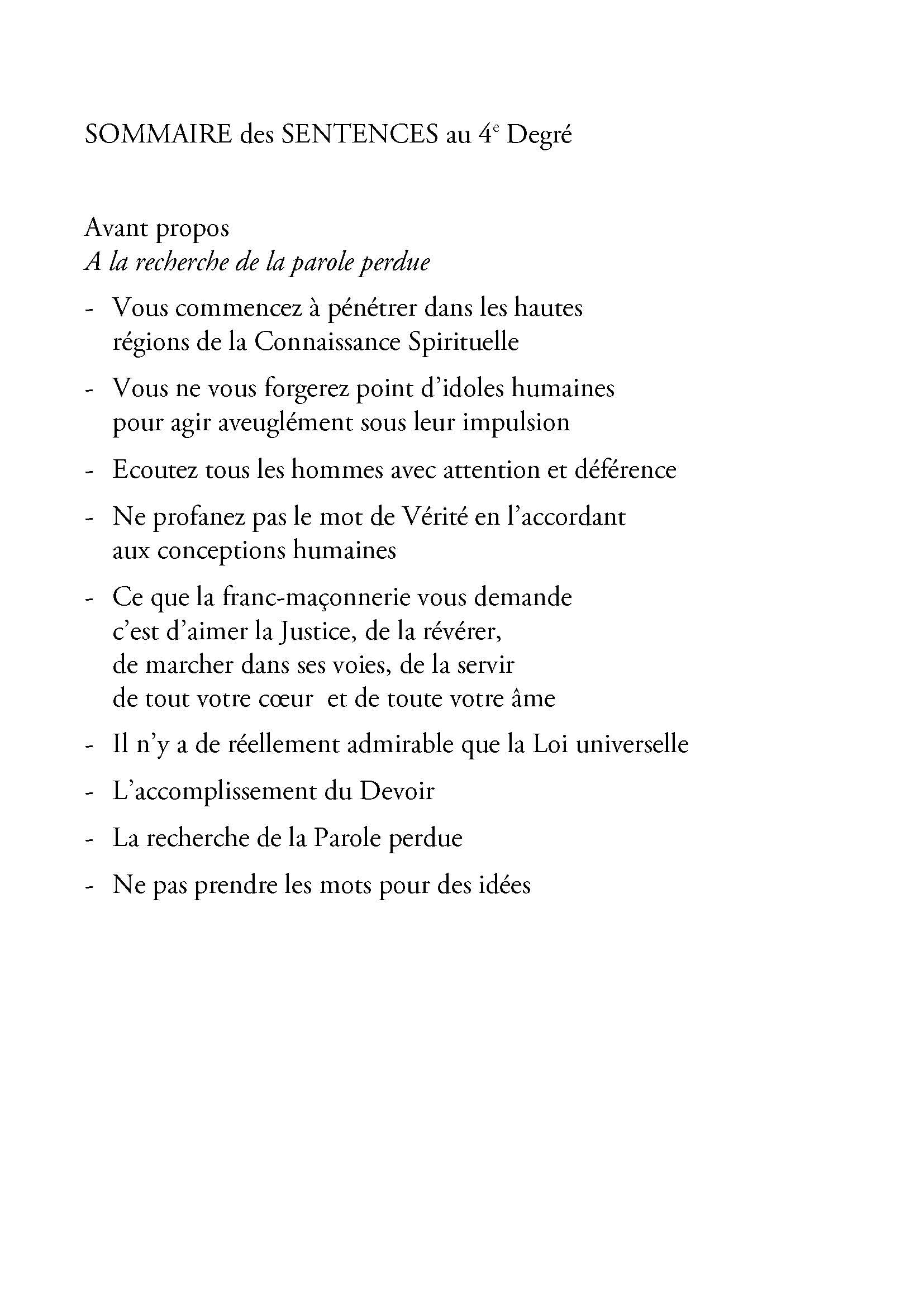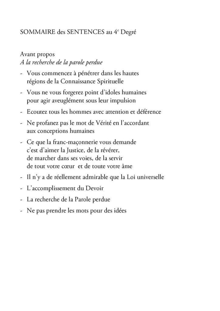 Pour leur part les voyages du 4ème degré reprennent la même problématique ascendante, transposant celle-ci dans le domaine de « la recherche d’une Connaissance métaphysique », en quête de la Vérité et de la Parole perdue.