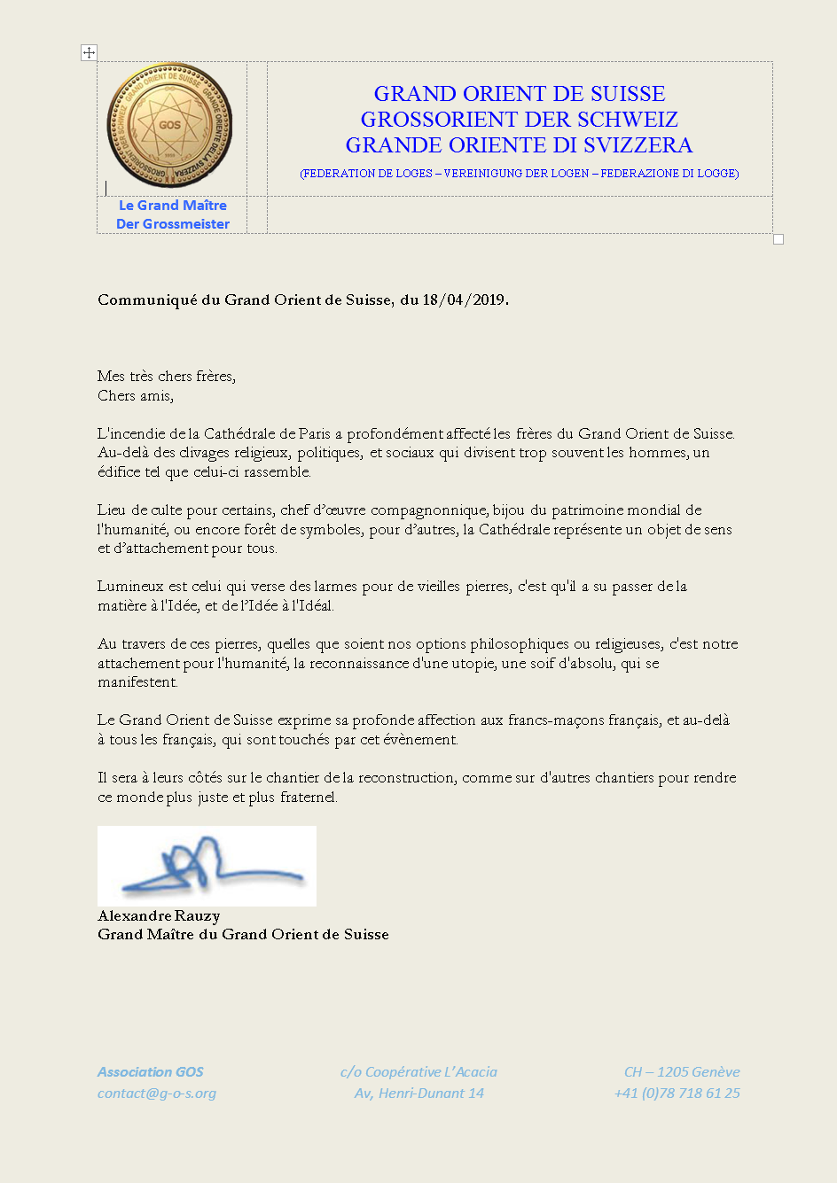 Le Grand Orient de Suisse exprime sa profonde affection aux francs-maçons français, et au-delà à tous les français, qui sont touchés par cet évènement. Il sera à leurs côtés sur le chantier de la reconstruction, comme sur d’autres chantiers pour rendre ce monde plus juste et plus fraternel.