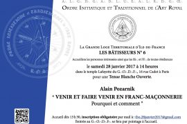 Paris – Le samedi 28 janvier 2017 à 14 heures, la Grande Loge Territoriale d’Ile-de-France LES BÂTISSEURS N° 6, sous l’égide de l’ Ordre Initiatique et Traditionnel de l’Art Royal (OITAR) accueillera les personnes intéressées ainsi que les Soeurs et…
