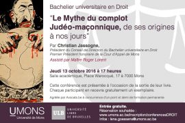 Mons (Belgique) – Conférence le jeudi 13 octobre 2016 sur le thème « Le mythe du complot Judéo-maçonnique, de ses origines à nos jours » par Christian JASSOGNE, Premier Président honoraire de la Cour d’appel de Mons Conférence organisée par l’Ecole de Droit…