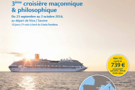 Après les deux premiers succès le Cercle philosophique et philanthropique de réflexion « Cannes Cercle Azurea« , en partenariat avec Costa Croisières, organise la 3ème Croisière Maçonnique et Philosophique de 10 jours du 23 septembre au 2 octobre 2016, au départ de Nice / Savone 10 jours /…