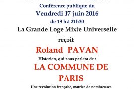Paris – Le prochain vendredis de la GLMU qui aura lieu le vendredi 17 juin 2016 de 19 h à 21 h 30 au Temple de la GLMU reçoit Roland Pavan, Président de Terre et Volcans qui évoquera « La Commune de Paris« : une révolution…