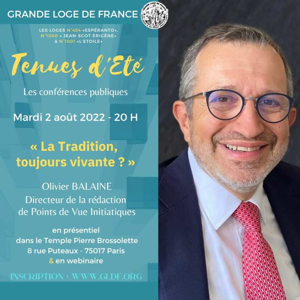 | le mardi 2 août à 20 heures pour une conférence animée par Olivier BALAINE, directeur de la rédaction de Points de Vue Initiatiques, la revue de la Grande Loge de France. Elle posera la question : « La Tradition, toujours vivante ? ». |
