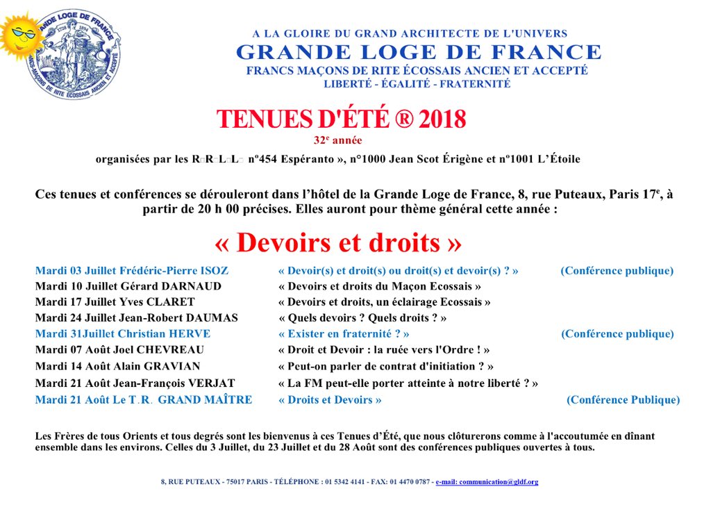 TENUES D’ÉTÉ 2018 DE LA GRANDE LOGE DE FRANCE – « DEVOIRS ET DROITS »