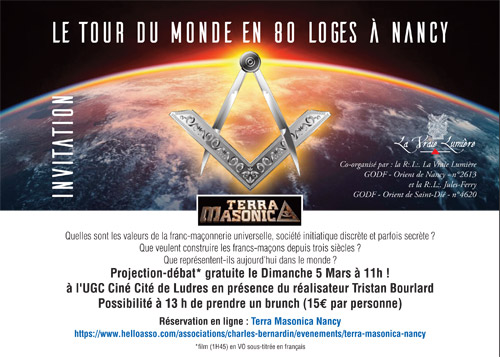 Dimanche 5 mars 2017 – Projection-débat co-organisée par la Loge La Vraie Lumière et la Loge Jules-Ferry à Nancy de Terra Masonica documentaire d’enquête sur l’expansion de la franc-maçonnerie dans le monde pratiquement tous les continents en visitant 80 loges maçonniques.