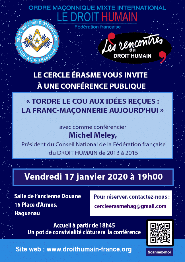 Le Cercle Érasme en partenariat avec “Érasme, Esprit Libre” à l’Orient d’Haguenau, vous convient à une Conférence Publique sur le thème :