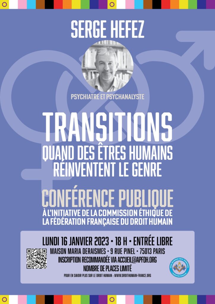 A l’initiative de la commission Ethique de la Fédération française du DROIT HUMAIN, Serge HEFEZ (psychiatre, psychanalyste) animera une conférence publique le 16 janvier 2023 à 18h sur le thème “Transitions – quand des êtres humains réinventent le genre”.