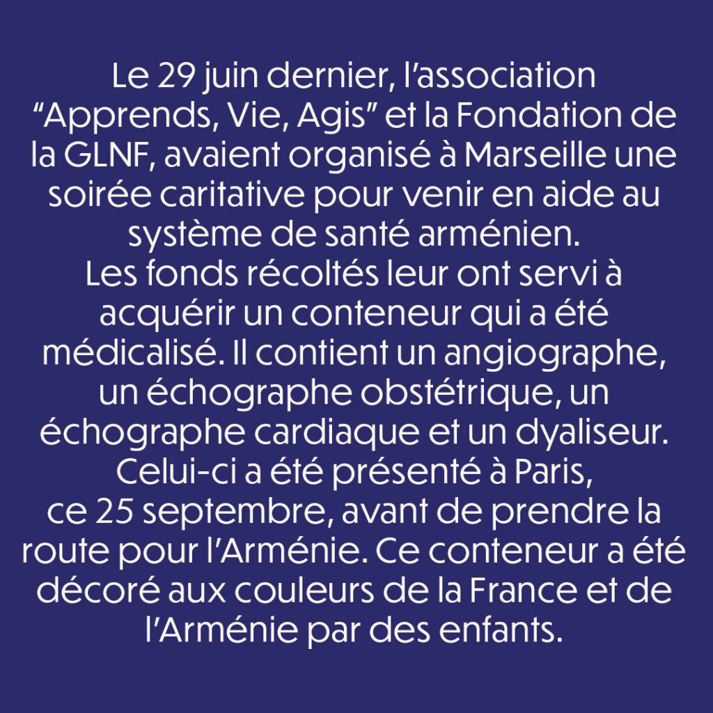 Le 29 juin dernier, l’association “Apprends, Vie, Agis” et la Fondation de la GLNF, avaient organisé à Marseille une soirée caritative pour venir en aide au système de santé arménien. Les fonds récoltés leur ont servi à acquérir un conteneur qui a été médicalisé.