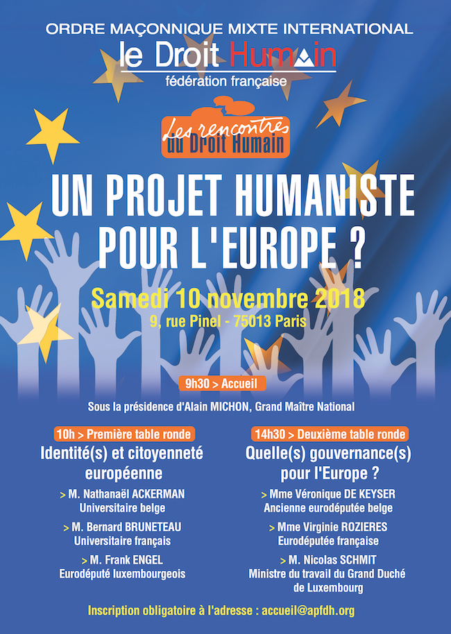 Dans le cadre du cycle des conférences-débats “Les Rencontres du DROIT HUMAIN”, la Fédération française de l’Ordre Maçonnique Mixte et International LE DROIT HUMAIN organise deux tables rondes sur le thème de l’Europe, le samedi 10 novembre 2018.