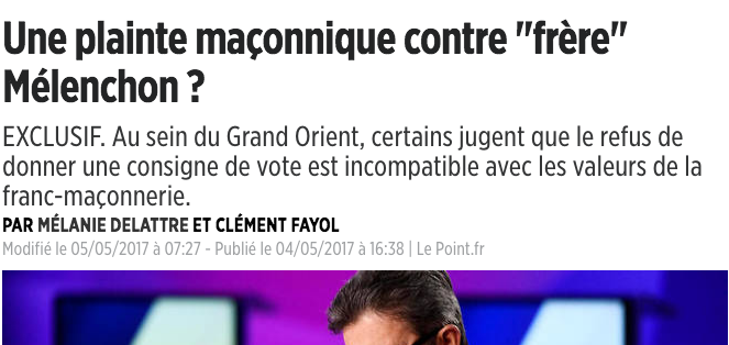Une plainte maçonnique contre « frère » Mélenchon ? telle est le titre de l’article de l’éditorial Le Point.fr qui annonce en exclusivité qu’une plainte serait sur le point être déposé à l’encontre du frère Jean Luc Mélenchon en raison de sa refus de donner une consigne de vote claire pour le 2° tour de l’élection présidentielle.