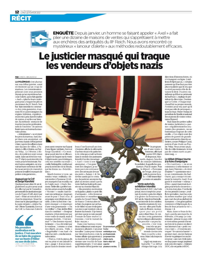 Début février 2021, nous apprenions au travers d’un article du Figaro qu’un lanceur d’alerte, prénommé «Axel» qui traque les ventes d’objets nazis, avait déniché qu’une vente aux enchères d’objets nazis en ligne se dissimulait sous couvert d’une vente aux enchères d’objets relatifs à « Ordre de chevalerie et décorations militaires – Diplômes – Médailles et franc-maçonnerie » .